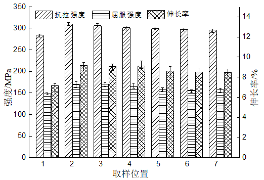 圖2:減震塔澆注系統設計 首次試制時,鋁液在壓鑄過程中順利充型,鑄件完整,表面無明顯缺陷,基本達到首次試制目標。對減震塔進行本體取樣,用WDW3200型室溫拉伸試驗機進行力學性能檢測,每個位置進行5組測試,拉伸速率為2 mm/min;采用OLYMPUS GX51金相顯微鏡、SEM(JEOL JSM6480型掃描電鏡)對減震塔取樣部位及拉伸斷口進行微觀組織形貌觀察。 性能檢測及分析 為研究減震塔鑄件的力學性能,進行本體取樣,取樣位置及編號見圖3。取樣位置涵蓋近澆口、遠澆口、鑄件中部及型腔內鋁液流動方向激變區,這些區域的力學性能可以代表減震塔鑄件的整體性能。 不同取樣位置的壓鑄態力學性能見圖4。對比可知,2號、3號、4號位置的平均抗拉強度均超過265 MPa,最大值為271 MPa,其他位置的平均抗拉強度則在250 MPa以下,最小值為247.5 MPa;所有位置的平均屈服強度相當,均在150 MPa左右,且波動較小,每組試樣測試差值在7 MPa以內;2號、3號、4號位置的平均伸長率在8%左右,最大伸長率為9.11 %,滿足設計要求,而其他位置的平均伸長率在4 %左右,其中1號位置伸長率最低,僅為1.78 %,遠低于要求的壓鑄態伸長率5 %以上。 影響鑄件抗拉強度和屈服強度的因素主要有基體強度、晶粒尺寸、第二相數量和分布等。由于檢測位置的材質相同,凝固溫度和冷卻速度基本一致,使得所有取樣位置的強度值基本相當。此外鑄造缺陷會影響鑄件的抗拉強度,但對其屈服強度影響不大,2號、3號、4號位置的抗拉強度高于其他位置,可能與本身鑄造缺陷較多有關。 對壓鑄件來說,除了材料本身,伸長率的好壞主要與鑄造缺陷有關。2號、3號、4號位置的伸長率顯著高于其他位置的伸長率,可能與這些部位的鑄造缺陷較少有關。這與抗拉強度分析的結果一致。