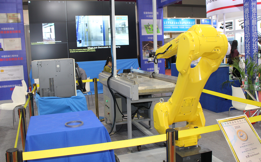 ![]() 廣州德琺麒展臺 在近日落幕的“第九屆國際(深圳)鑄業(yè)展”上,機器人集成及壓鑄島解決方案提供商——廣州德琺麒自動化技術(shù)有限公司推介其在高速電機轉(zhuǎn)子專用壓鑄島解決方案。 據(jù)介紹,德琺麒高速電機轉(zhuǎn)子壓鑄島是由一臺180T壓鑄機、兩臺機器人、一臺去渣包機、一套料柄回爐傳送帶、一個產(chǎn)品上件機,配上一個高壓靜電煙塵罩組成。項目生產(chǎn)流程包括經(jīng)過機器人穩(wěn)定放件、壓鑄機上鑲件、機器人高速取件、去料柄及渣包、循環(huán)輸送帶送廢料回爐、機器人碼垛裝框等工序。全程不需要人員參與,代替所有人工操作,實現(xiàn)壓鑄過程全自動化。壓鑄的循環(huán)生產(chǎn)周期為13S, 產(chǎn)品為進口吊風扇中的電機轉(zhuǎn)子。