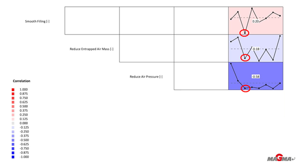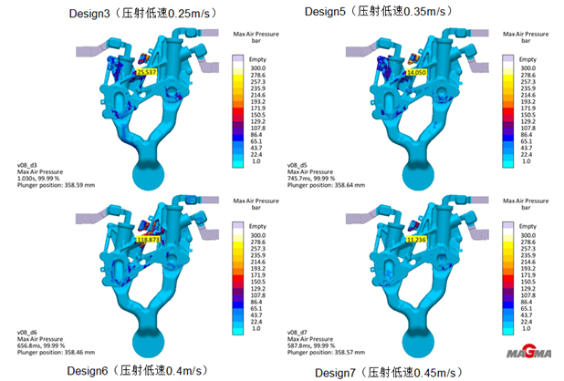 圖2:油冷器剖視圖 二、虛擬填充選擇最佳的壓鑄低速 由于鋁合金高壓鑄造過程中的壓射低速階段的低速參數很難精確地掌握,試制過程中僅憑經驗對參數進行調整,導致廢品較多,工藝穩定性差。結合Magma軟件對鋁合金高壓鑄造過程進行模擬填充,確定低速參數,可以避免壓鑄工藝參數調整的盲目性,減少調試廢品,穩定壓鑄工藝。 1、虛擬試驗工藝參數設定及優化 運用MAGMASOFT 模擬汽車零件油冷器的填充成型,根據同類型產品的經驗,設定模擬的常量條件:采用4000 kN壓鑄機,澆注溫度為660°C,定模溫度為150°C,動模溫度為150°C,壓室溫度為180°C,壓室的有效距離為395 mm,鑄造壓力為78 MPa,高速位置為237 mm(內澆口),高速速度為4 m/s,噴涂4 s,吹干3 s,壓射延時2 s,合模3 s。 設置以降低氣壓(Reduce Air Pressure),減少卷氣(Reduce Entrapped Air Mass),提高填充的光滑性(Smooth Filling)為優化目標。填充光滑性是MAGMASOFT軟件特有的模擬結果判據指標。簡單地說填充光滑性數值越小,越填充性能越好。 設置多組低速參數進行優化模擬,低速數值范圍在0.15~0.5 m/s之間,步長設定為0.05 m/s。軟件對輸入的低速工藝參數自動排列組合,生成8個方案及模擬結果,見表1。 可以看出Design5(低速0.35m/s)、Design3(低速0.25m/s)、Design7 (低速0.45m/s)、Design6(低速0.40m/s)效果最佳,為備選方案。 通過分析DOE綜合性指標曲線圖(見圖3)和 DOE綜合性指標趨勢圖(見圖4),從減低氣壓、減低卷氣的指標觀察,Design3(低速0.25 m/s)、Design5(低速0.35 m/s)、Design6(低速0.40 m/s)、Design7 (低速0.45 m/s)比較接近。從備選方案的模擬氣壓結果分析(見圖5),Design3鑄件的最高氣壓為2.554 MPa,Design5鑄件的最高氣壓為1.405 MPa,Design6鑄件的最高氣壓為11.887 MPa,Design7鑄件的最高氣壓為1.124 MPa,Design6鑄件氣壓分布最差,其余方案區別不大。從備選方案的模擬卷氣結果分析(見圖6),Design3鑄件的最高卷氣為54.35 μg,Design5鑄件的最高卷氣為63.08 μg,Design6鑄件的最高卷氣為757.95 μg,Design7鑄件的最高卷氣為135.09μg,Design6鑄件的卷氣最差,Design3與Design5的卷氣情況最好。但考慮到填充性能,選擇填充性能最好(光滑性數值最小)的Design3(低速0.25 m/s)作為壓射低速階段的低速參數。