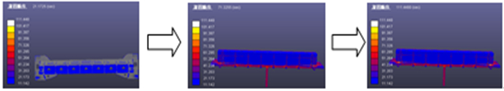圖10:充型模擬過程 鑄件凝固過程模擬見圖11。可以看出,鑄件從上往下凝固,剛剛開始時,鑄件凝固較快,但整個梁身的冷卻時間比較集中,可能造成補縮不能順利進行,從而造成鑄件的不完整以及梁身的內應力達不到要求;到后期,由于鑄型的溫度有所增加,凝固較慢,靠近澆注系統處最后凝固;根據鑄件凝固過程模擬分析,鑄件內澆道處最先開始凝固,說明鑄件可以通過自身膨脹實現補縮;鑄件從頂部壁薄處開始凝固,壁厚處最后凝固。因此鑄件的凝固復合低壓鑄造原理,由此凝固順序及凝固時間可以驗證改工藝較合理。