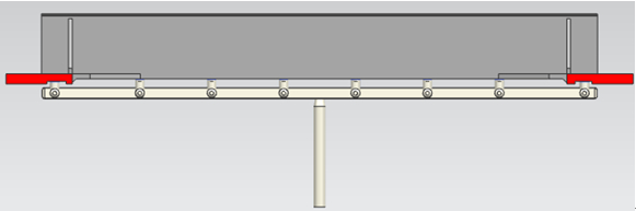 圖4:澆口位置 由于鑄件體積較大,長高比大,且對鑄件質量要求較高,結合金屬型鑄造及低壓鑄造的工藝特點,橫梁采用底注式澆注系統,1個升液管、1個橫流道、16個分流道、16個內澆道的澆注系統澆注。金屬液通過布置在橫梁底部中心位置處的升液管進入橫流道,橫流道布置于橫梁底部中間,分流道別對應澆口位置設計。經計算,得出澆注時間為34.12 s,充型時間為12.6 s;內澆道形狀為圓形,內澆道出口的速度取12 cm/s,則內澆道的截面尺寸為523 cm2,截面圓的直徑為25.3 cm;內澆道截面尺寸確定后,根據截面積比A升:A橫:A內=(2~2.3):(1.5~1.7):1,得A升為1 203 cm2,A橫為889 cm2。橫澆道的截面為梯形,梯形上下底邊分別為24 cm、28.4 cm,高度為34 cm。升液管下部在金屬液中,上部與鑄型連接,是金屬液體流入型腔的通道,升液管的截面形狀為圓形,在靠近橫澆道位置處減小截面積提高充型壓力;截面圓直徑為40.6 cm,靠近截面處的錐形錐度為18°。對于鋁合金,升液管離坩堝底部的距離一般為50~100 mm。設計的升液管與澆道的連接方式見圖5。