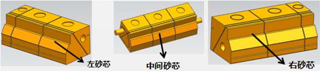 3.3砂芯的排氣 由于樹脂自硬砂制芯,因此,在設計、制造砂芯過程中,要注意砂芯的排氣,使砂芯中產生的氣體能夠從砂芯芯頭排出,見圖9。在管道砂芯內部埋入隨型的蠟線,蠟線熔出后得到彎曲的排氣道;中間砂芯部分用通氣針扎出排氣道。