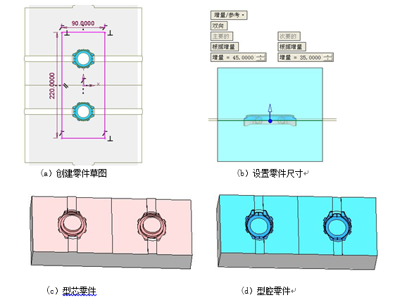 圖2:創建分型面 3、型芯、型腔零件設計 選擇動板系統建立一個命名為“型芯”的文檔,利用草圖繪制工具在XY平面上創建草圖,見圖3a,設置拉伸正增量為45 mm,反向增量為35 mm,見圖3b,通過軟件參數化的切除功能完成型芯設計,見圖3c。選擇定板系統同樣方法可完成型腔設計,見圖3d。