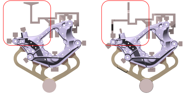 圖5 進澆方案評估結果 3.2 排溢系統確定 在確定進澆方案采用推薦的方案1后,進行了產品的流動分析。根據流態的走向,流態相交匯和流動末端的位置,見圖6a所示。在鋁液交匯和流動末端增加排溢系統,將冷料進行有效的排放,以此確保鑄件成型質量,詳見圖6b所示。