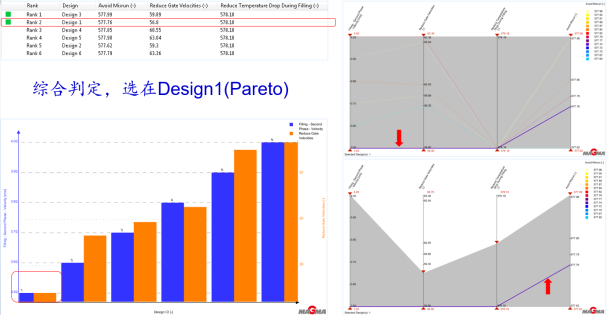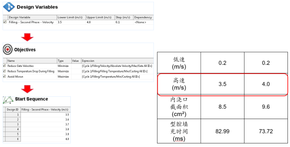 c.氣壓對比分析圖 圖7:排溢系統優化和優化模擬結果對比 4.DoE工藝參數優化 在確定好澆排系統之后,還需要對壓鑄工藝參數進行設計和計算。MAGMASOFT?的自主優化工具,使得工程師能通過了解工藝變量對鑄件質量的影響,更為省時省力地探索更大的設計空間,進而找到最優的壓鑄模具和工藝布置方案。與傳統模擬不同,自主模擬只需要工程師設定一次模擬,但是,很多模擬運行將覆蓋全部工藝窗口。該軟件自主地挑出可能的設計,進行分析并采用統計數據方式匯總所有結果。 基于澆排系統設計完成的基礎之上,借助DoE自主優化工具進行壓鑄工藝參數的優化。高速速度是影響鋁液填充和產品質量的關鍵參數。以高速速度的DoE優化過程為研究對象,進行分析。設定高速速度在3.5-4.0m/s之間,迭代步長設定為0.1,以降低澆口速度及減小冷隔缺陷為目標對象。通過軟件進行大數據分析與統計后,推薦出最佳成型工藝參數,選擇高速速度3.5m/s既可以滿足澆口速度低,降低模具充蝕,又可以保證產品的質量。詳見圖8所示。