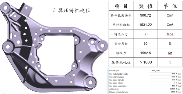 圖1:橫梁產品結構圖 2.前期計算與分析 在產品前期開發階段,將毛坯3D導入MAGMASOFT?,軟件可自動計算出包含產品體積,重量,截面積,投影面積等在內的基礎數據,然后進一步計算出生產該產品所需要的壓鑄機臺噸位并與軟件機臺數據庫對應的機臺相匹配,如圖2所示。