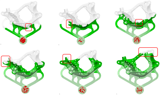 b.DoE模擬結果 圖8:DoE與數據統計 5.產品試制結果 通過MAGMASOFT?的澆注方案及參數設計的標準流程,完成了產品的澆排系統設計及壓鑄工藝參數的優化,以此數據為指導,用于實際的驗證。首次試制選用1600T壓鑄機,并輔助以真空系統,按照DoE優化設計的壓鑄參數進行試制。圖9為首試的鑄件圖。通過對內部品質的x光探測發現鑄件內部的品質比較理想,內部品質缺陷如氣孔、縮松以及縮孔均符合ASTM F_5051級的標準。產品經過焊接驗證,焊接區域未發生有焊接缺陷,證明產品的內部含氣量很低。產品首次試制成功。