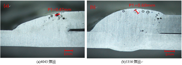 表3:真空壓鑄鋁合金減震塔(改善后)本體取樣力學性能 3.2 焊接性能檢測 對減震塔本體取樣進行MIG焊接,焊絲采用ER4043和ER5356兩種焊絲,對焊接接頭進行拉伸測試和宏觀金相觀察。焊縫接頭的力學性能檢測結果見表4。可見,保留焊縫余高時,采用ER4043焊絲的焊縫接頭的平均抗拉強度為150.93 MPa,接頭強度系數達到母材的69.82 %;采用ER5356焊絲的焊縫接頭的平均抗拉強度為163.91 MPa,接頭強度系數達到母材的75.82%;打磨掉焊縫余高時,采用ER4043焊絲的焊縫接頭的平均抗拉強度為149.67 MPa,接頭強度系數達到母材的69.23%,采用ER5356焊絲的焊縫接頭的平均抗拉強度為164.67 MPa,接頭強度系數達到母材的76.17%??梢?,采用ER5356焊絲焊接比ER4043焊絲焊接接頭靜載工況下性能更優,采用ER5356焊絲能滿足焊接接頭強度系數大于70%的要求。從焊縫接頭拉斷形式看,當保留余高時,兩種焊絲焊接焊縫基本斷裂在熔合區,這可能是由于在鑄件熔合區Fe元素偏聚,形成了Al-Fe-Si等富Fe相,削弱接頭處熔合區的性能所致;當打磨掉焊縫余高時,兩種焊絲焊接焊縫基本斷在焊縫區,這是由于焊縫中心位置為最后凝固冷卻的位置,此處應力較大,偏析嚴重,沒有余高增強后,此處為最弱的區域。對鑄件焊接后的斷面氣孔進行了觀察,見圖7,可見兩種焊絲焊接后氣孔數量及尺寸相差不大,最大氣孔尺寸在0.5 mm左右,基本滿足使用要求,但也存在進一步優化的空間。