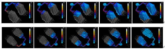圖4:減震塔模流仿真圖 控制保溫爐中鋁液密度>2.64 g/cm3,鋁液含渣量K≤0.1。通過優化,得到較優熱處理參數:固溶460 ℃/150 min,時效200 ℃/180 min。 Mg含量適當降低有助于提升真空鋁合金壓鑄件的伸長率,但同時會降低屈服強度,見圖4,本課題結合對強度性能的要求,將Mg含量將至0.3%。