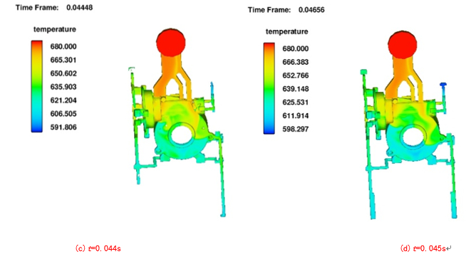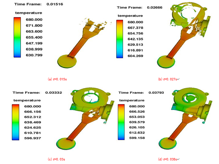 圖5:原始工藝方案 2、數值模擬與優化 2.1 數值模擬 將原始壓鑄方案導入FLOW-3D軟件中進行數值模擬,圖6為原始方案流場分布結果。通過模擬結果可得,壓鑄件最高溫度為680 ℃,最低溫度約為603 ℃。型腔內金屬溫度隨著與內澆口距離的增大,其溫度大致呈逐漸降低的狀態。溫度決定凝固的順序,溫度較低的位置首先凝固,溫度較高的位置凝固較慢。充型過程較不平穩,在t=0.027 s時發生液滴飛濺現象。綜合分析得到,在模擬過程中,壓鑄件凝固方式為逐層凝固,并且按照遠離內澆口的方向先凝固的順序,所以能夠及時得到補縮,故而不會出現較為嚴重的縮松縮孔。