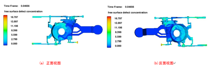 圖8:表面缺陷模擬結果及分析 2.2 工藝優化 原始壓鑄方案卷氣較嚴重,需要進行工藝優化,正確選擇澆口的位置和導流方式,對于非良形狀的鑄件多采用多股內澆口,設置3個內澆口,內澆口寬度為8 mm、10 mm、20 mm。長度為5 mm,增加了內澆口截面積從而使得壓射速度提高。為了改善排氣條件,在鑄件兩側增設環形溢流槽,溢流槽1尺寸為A=5 mm,H=8 mm,B=15 mm;溢流槽2尺寸為A=10 mm,H=10 mm,B=15 mm, 溢流槽3尺寸為A=5 mm,H=8 mm,B=15 mm吊耳處增設溢流槽,尺寸為A=15 mm,H=10 mm,B=20 mm,同時設置一個圓柱形冒口,R=10 mm,H=15 mm。為了增加排氣效果,改善卷氣,在鑄件端蓋處增加排氣槽。排氣槽用于從型腔中排出空氣及涂料揮發產生的氣體。為了使型腔中的氣體在壓射時盡可能多的被金屬液排出,將排氣槽設置在金屬液最后填充的位置。優化工藝的三維圖見圖9。
