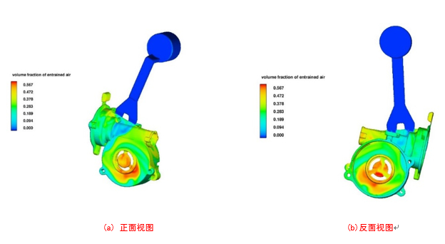 圖7:卷氣分布模擬結果 根據模擬結果來看,壓鑄件表面缺陷最高處達到7.3%左右,但處于排溢系統上,而鑄件主體大部分表面質量低于2%,基本不會影響鑄件的使用。再結合圖7發現,在表面缺陷最嚴重的位置的卷氣量也很高。因此判斷表面缺陷的產生和鑄件內的卷氣量有著很大的關系。因此想要改善表面質量,則需要從卷氣量來入手,進行優化方案的設計。