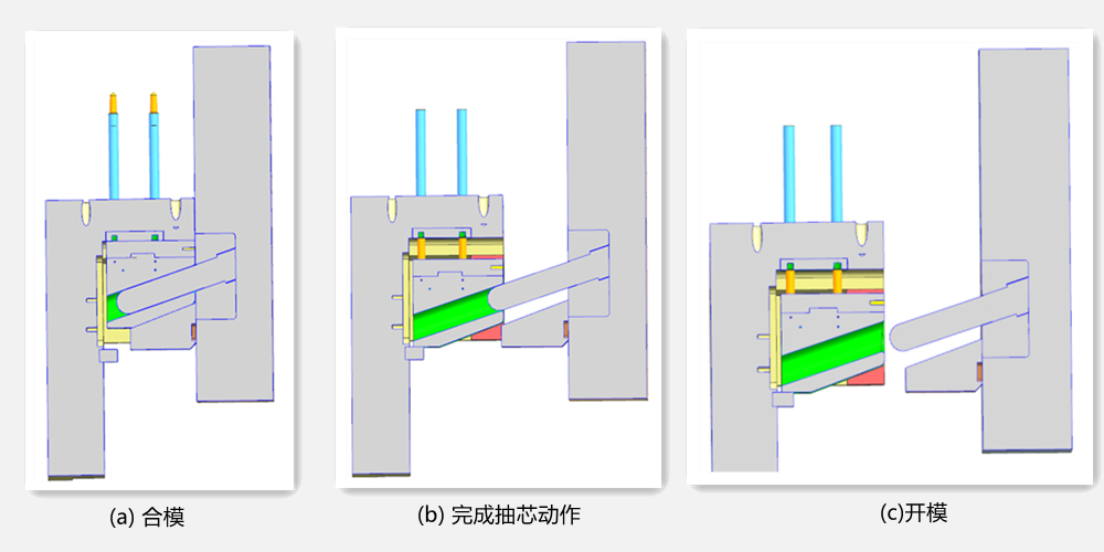 3.2 二次抽芯結構設計 圖4為殼體下滑塊結構,圖5為二級抽芯動作過程。壓鑄件成形后開模,開模力使斜銷和側滑塊5、6的斜孔做相對運動。由于側滑塊以間隙配合的形式安裝在動模板的壓條槽內,故驅動側滑塊向外移動。當移動到抽芯距離后,完成側抽芯和開模的動作。這時在限位塊的作用下,側滑塊準確停留在斜銷抽出滑塊時的終止位置上,以免在下次合模時斜銷和斜孔錯位,發生碰撞事故。 合模時,斜銷準確地進入側滑塊的斜孔,并帶出復位動作。但僅靠斜銷的定位是很困難的,而且斜銷的鎖壓作用在受壓射壓力的高壓沖擊時會引起側滑塊的后退。因此設計側滑塊的鎖緊裝置,即楔緊塊,其內側與小滑塊尾部以斜面研合接觸,確保側型芯的精確定位,并鎖緊側滑塊,防止因受側向壓射壓力而產生位移或后退。