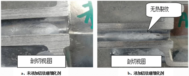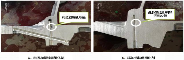 圖3:Al-Ti-B細化劑加入前后對鑄件鑄造缺陷的影響 圖3為Al-5Ti-1B細化劑加入前后對鑄件鑄造缺陷旳影響。可以看出,未添加Al-5Ti-1B細化劑的鋁合金液生產的鑄件,出現明顯因收縮而產生的凹坑及縮裂,而添加Al-5Ti-1B細化劑后的鋁合金液,相同部位縮坑及縮裂缺陷消失,產品合格率大幅提升,見表5。