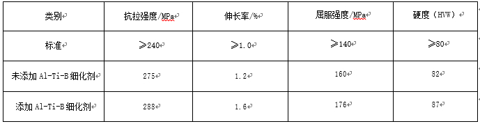 圖4:添加Al-Ti-B細化劑前后對鑄件內部收縮缺陷的影響 通過對易產生縮孔的壁厚部位進行刨切的前后對比,見圖4,可以看出未添加Al-5Ti-1B細化劑的鋁合金液生產的鑄件,縮孔明顯;而添加Al-5Ti-1B細化劑的鋁合金液生產的產品,縮孔明顯得到改善(見表5)。 4、添加Al-Ti-B細化劑后對鋁合金力學性能的影響