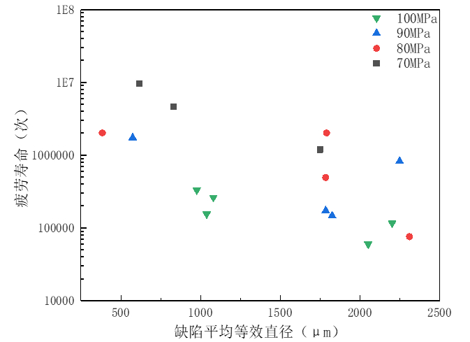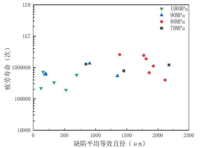 圖8:半固態壓鑄試樣裂紋源缺陷平均等效直徑VS疲勞壽命 兩批試樣的疲勞壽命與裂紋源缺陷尺寸的關系見圖7和圖8。可以看出,液態壓鑄試樣表現為裂紋源缺陷的尺寸越小,試樣的疲勞性能越好,而半固態壓鑄試樣隨缺陷尺寸的變化規律卻不明顯。僅在80MPa 應力級上表現為缺陷尺寸越小,試樣的疲勞性能越好。
