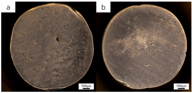 圖9:不同工藝疲勞試樣典型斷口形貌:(a)液態壓鑄;(b)半固態壓鑄 兩批試樣典型低倍疲勞斷口形貌見圖9。近斷口截面缺陷圖見圖10。從圖9a可以看出液態壓鑄試樣的斷口除了中心縮松區域以外裂紋擴展區以及瞬斷區出現了大量的氣孔。在圖10a上也可以看出近斷口截面大量氣孔彌散分布,同時存在尺寸較大的氣縮孔。從圖9b可以看出,半固態壓鑄件的斷口形貌除中間大孔外,孔洞很少,且靠近心部,而圖10b也反映孔洞集中在中部這一規律。但值得注意的是,與圖9b斷口形貌上的中間大孔相比,斷面上的孔要小得多。因此推測孔洞在三維上可能是互通或位置非常接近的,這樣裂紋源孔洞在初始擴展階段合并周圍的小孔最終形成一個大孔裂紋源。 液態溫度下鋁合金的充型相對不穩定,容易形成紊流,從而卷集空氣進入金屬液中,若不能及時排出則會留下氣孔,同時,金屬漿料在制備和轉移的過程中會溶解一定氫氣,在鑄型型腔中凝固時又會析出,這種形式產生的氣孔多在整個截面彌散分布。位于裂紋擴展區的大量氣孔,在一定程度上會加速裂紋擴展,導致鑄件的疲勞性能下降。同時液態溫度下,金屬在凝固過程中,溫度變化更大,鑄件最后凝固的部位更容易出現尺寸較大的縮孔和縮松。半固態溫度下鋁合金漿料的粘度顯著提高,充型方式則為平穩的層流充填,充型過程減少了空氣的卷入,同時更低的溫度也降低了氫氣的溶解和漿料的收縮,使得半固態試樣的缺陷主要集中在最后凝固的試樣截面中心部位,且缺陷尺寸比液態壓鑄試樣更小,見圖10b。