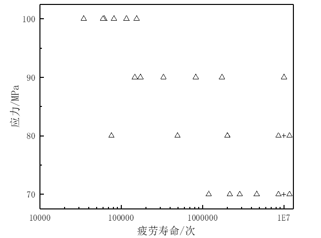 圖3:半固態壓鑄試樣疲勞試驗結果 液態和半固態壓鑄試樣的疲勞試驗結果如圖2和圖3。可以看出兩組數據在每個應力級上均有較大的離散度。但對比可以明顯看出總體上半固態壓鑄試樣的離散程度明顯小于液態壓鑄試樣。液態壓鑄試樣的疲勞壽命在80 MPa和90 MPa應力級上呈現了極大的離散度。在100 MPa應力級上,可以明顯看出液態壓鑄試樣的疲勞壽命在100 000次附近明顯低于半固態壓鑄試樣的400 000次。在其他應力級對比不明顯的情況下,這能夠在一定程度上反映出半固態壓鑄試樣的疲勞強度優于液態壓鑄試樣。