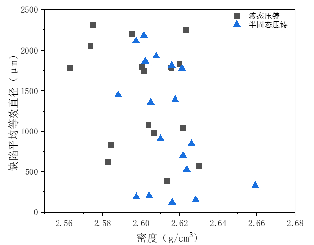 圖4:疲勞試樣密度與裂紋源缺陷平均等效直徑的關系 兩批試樣的密度與裂紋源缺陷尺寸的關系見圖4。液態壓鑄試樣的平均密度為2.598 g/cm³,半固態壓鑄試樣的平均密度為2.616 g/cm³。可以看出液態壓鑄試樣的密度相較于半固態壓鑄試樣更為離散,液態壓鑄試樣的密度區間為2.563 ~2.631g/cm³,半固態壓鑄試樣的密度區間為2.588 ~2.659 g/cm³。兩批試樣的裂紋源缺陷平均等效直徑均有較大波動,但半固態壓鑄試樣的總體偏低。 2.2 鋁合金ZL114A壓鑄件密度對疲勞性能的影響
