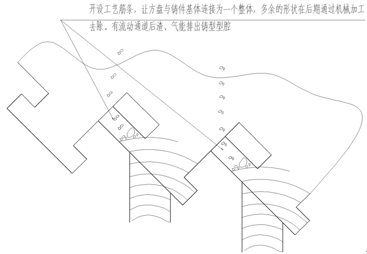 圖7:氣孔缺陷形成過程 基座鑄件的樹脂砂鑄型整體高度達到了1400 mm以上,鑄件型腔復雜、轉角較多,升液速度設置過快,合金熔液在型腔內產生紊流卷氣;合金熔液流動距離遠,到達鑄型頂部的熔液溫度很低,不利于氣、渣排出鑄件型腔,易于在鑄件中上部產生夾渣及氣孔等缺陷。 基座鑄件頂部左右兩側的縫隙澆道間距很近,澆注時鑄件頂部縫隙澆道周圍過熱而導致鑄件頂面處安裝邊產生疏松、縮孔缺陷;同時鑄件頂部是型腔中渣、氣聚集區,氣和渣阻礙縫隙澆道對鑄件的補縮,加重了鑄件產生疏松、縮孔缺陷的情況。 4、解決措施 針對基座鑄件方盤上部產生氣孔的原因,從鑄造工藝上優化鑄件局部結構,讓渣、氣有時間、條件沿著開設的工藝通道排出型腔或進入鑄件加工余量范圍內,有利于減輕鑄件產生渣氣孔缺陷的概率(見圖8)。