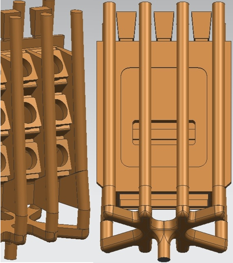 圖2:低壓鑄造基本原理圖 基座鑄造工藝方案見圖3。安裝大面垂直放置,在鑄件安裝大面和9處法蘭盤部位共開設8道縫隙澆口,鑄件外側的4道澆口正對鑄件兩側側壁,中部4道澆口正對鑄件內腔的加強筋板,在鑄件頂部相鄰兩道縫隙圓棒之間安放3個冒口,在熱節部位安放鋼冷鐵和石墨激冷,形成有利于順序凝固的條件。
