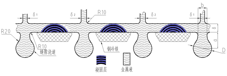 式中,Ag為內澆道截面積,cm2;W為鑄件質量,g;ρ為合金密度,g/cm2;υ是內澆道出口線速度,cm/s;保證金屬液平穩充型,υ值應不大于15 cm/s;t是充型時間,s,按合金在型內上升速度計算,t=h/υ升(h為型腔高度,cm),υ升=1~6 cm/s。t 用UG三維模型估算鑄件澆注質量約為490 kg,采用縫隙式澆道進行補縮,見圖4。縫隙澆口最小厚度b選擇取1.15δ,縫隙圓棒采用上小下大形式,小端直徑D取值為2.5b,斜度為1.5°,縫隙圓棒中心線至鑄件外壁距離a取60 mm。在相鄰兩道縫隙澆道之間安放專用鋼冷鐵,冷鐵兩端倒角斜角,冷鐵厚度為1.3δ。縫隙式內澆道數量為8根,間距取為200~220 mm。