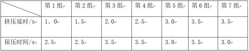 圖3:擠壓銷結(jié)構(gòu) 5、生產(chǎn)驗(yàn)證 5.1 擠壓參數(shù)調(diào)試 在擠壓生產(chǎn)時(shí)根據(jù)增壓信號(hào)設(shè)定延時(shí)擠壓時(shí)間和保壓時(shí)間,在調(diào)試生產(chǎn)時(shí)通過設(shè)定不同的擠壓延時(shí)和保壓時(shí)間驗(yàn)證獲得最佳外部和內(nèi)部品質(zhì),見表1。