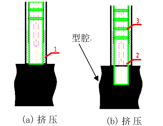 圖2:產(chǎn)品剖切 4、局部擠壓方案確定 4.1擠壓位置分析 因泄漏位置為動(dòng)模側(cè)兩支油道之間,且此位置壁厚較厚,且不均勻,油道孔徑比較小(Φ6 mm),內(nèi)部易產(chǎn)生縮孔。在油道孔對(duì)面靜模側(cè)有Φ16 mm斜抽芯孔,和油道孔之間壁厚較大,通過對(duì)斜抽芯孔型芯進(jìn)行改造,將抽芯改為抽芯加擠壓,可以大面積補(bǔ)縮到油道孔內(nèi)部縮孔部位,增大油道孔之間的致密度。 4.2 擠壓設(shè)計(jì) 通常局部擠壓功能都是分布在動(dòng)、靜模方向,和壓鑄機(jī)開模方向一致,擠壓銷在開模后任意時(shí)刻進(jìn)行抽插動(dòng)作。本課題局部擠壓在側(cè)面斜滑塊方向,在機(jī)床開模前擠壓銷必須完全退回離開鑄件,否則會(huì)造成開模后擠壓銷拉斷鑄件,且在生產(chǎn)過程中若出現(xiàn)退出卡頓,不完全退出時(shí)也會(huì)造成鑄件拉裂。 為防止擠壓銷在移動(dòng)過程中和銷套之間出現(xiàn)卡頓,增加插芯噴涂功能,開模噴涂時(shí)需要將擠壓銷從底部位置再次頂出到位,接受噴涂潤(rùn)滑,增加擠壓銷的潤(rùn)滑性。隨后,擠壓銷再次退回到底等待合模壓射。鑒于以上生產(chǎn)風(fēng)險(xiǎn)和插芯噴涂功能要求,局部擠壓采用抽芯加擠壓結(jié)構(gòu),在開模取出鑄件后,由噴涂機(jī)器人控制擠壓銷油缸頂出到位信號(hào),在噴涂時(shí)驅(qū)動(dòng)油缸頂出,實(shí)現(xiàn)插芯噴涂功能。在壓射擠壓后由壓鑄機(jī)控制擠壓銷油缸退出,若擠壓銷不能退位到底,機(jī)床抽芯信號(hào)報(bào)警,防止強(qiáng)制開模拉裂產(chǎn)品。 4.3 局部擠壓的結(jié)構(gòu)示意 由于擠壓銷位置的特殊性,其退到位時(shí)端面和產(chǎn)品端面齊平,壓射時(shí)直接擠壓鑄件底孔,具體結(jié)構(gòu)形式見圖3。可以看到,此種加壓方式為擠壓銷直接擠壓鑄件孔,避免鋁液和擠壓銷接觸,不會(huì)出現(xiàn)鋁液進(jìn)入擠壓銷套內(nèi)將其卡死或者磨損。并且擠壓銷在噴涂時(shí)伸出,得到定點(diǎn)噴涂的潤(rùn)滑,大大減少了擠壓銷和銷套之間的摩擦。此外,在銷子上做出油槽涂潤(rùn)滑脂,保障了局部加壓連續(xù)生產(chǎn)。 4.4 擠壓銷和銷套間隙控制 擠壓銷和銷套之間的公差配合間隙直接影響生產(chǎn)連續(xù)性和擠壓銷的使用壽命。一般情況下,擠壓銷和銷套配合公差越大,間隙越大,擠壓銷套內(nèi)容易進(jìn)入鋁液卡死。模具擠壓銷公稱尺寸為φ15 mm,和擠壓銷之間間隙為0.05~0.11 mm。