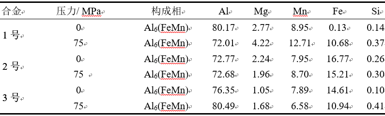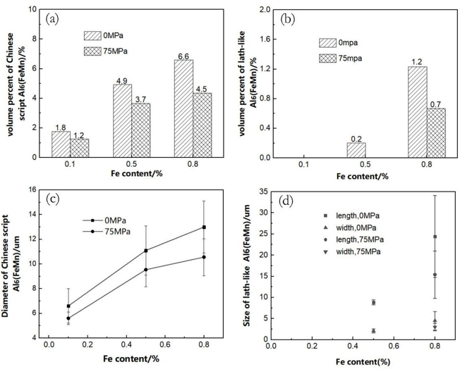 表2:富鐵相的能譜分析結果 wb/% 不同壓力和不同Fe 含量下的Al6(FeMn)相體積分數和尺寸的變化見圖2。由圖2a,圖2b可知,漢字狀和板條狀Al6(FeMn)相的體積分數隨著鐵含量的增加而增加,當擠壓壓力為75 MPa時,合金中的漢字狀和板條狀Al6(FeMn)相的體積分數減少。由圖2c可知,漢字狀Al6(FeMn)相的尺寸隨著Fe含量的增加而增大。當擠壓壓力為0時,隨著Fe含量從0.1%增加到0.8%,漢字狀Al6(FeMn)相的尺寸由6.6 μm增大到12.8 μm。然而75 MPa的擠壓壓力明顯降低了漢字狀Al6(FeMn)相的尺寸,降低了約50%。由圖2d可知,板條狀Al6(FeMn)相的長度和寬度隨著Fe含量的增加而急劇增大。當擠壓壓力為0時,隨著Fe含量從0.1%增加到0.8%,棒狀Al6(FeMn)相的平均長度增大到24.4μm,平均寬度增大到4.5μm。然而75 MPa的擠壓壓力顯著減小板條狀Al6(FeMn)相的長度和寬度,隨著Fe含量從0.1%增加到0.8%,板條狀Al6(FeMn)相的平均長度增大到15.4 μm,平均寬度增大到3 μm。