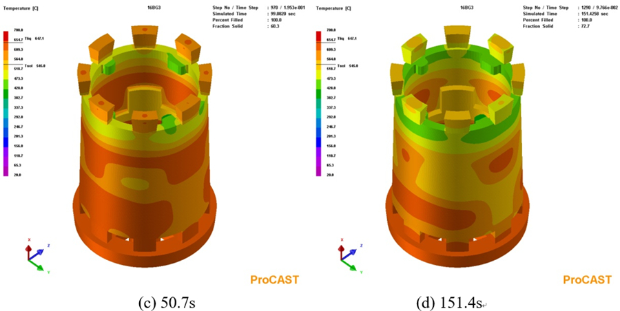 圖10:改進設計后鑄件充型過程溫度場 圖11為合金液充型結束后凝固過程中鑄件于不同時間的溫度分布圖。可以看出,合金液充型結束后,鑄件降溫最快區域為鑄件頂部的上端框處。該區域合金液最先進入型腔,再加上上端框處放置著冷鐵,合金液冷卻速度較快,溫度最低;冒口相對上端框部位的凝固溫度更高,凝固時間更長,冒口對上端框區域具有一定的補縮作用。整個鑄件自上而下溫度逐漸升高,符合自上而下逐層順序凝固的設想。隨著時間延長,鑄件整體的溫度逐漸下降,但整個降溫過程中鑄件一直保持著自下而上溫度逐漸升高的正溫度梯度,能最大限度地發揮冒口的補縮作用,降低鑄件內部縮松類缺陷的傾向,有利于改善整個鑄件的品質。鑄件的整個凝固過程中沒有出現局部過熱情況,完全呈現出自上而下的順序凝固,鑄件的縮松傾向相對于改進前大大減小。