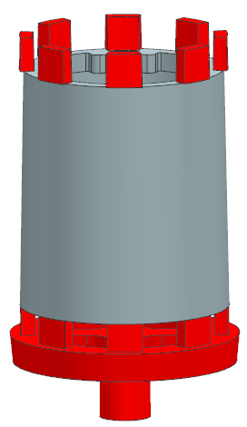 圖1:筒形件三維模型圖 2、鑄造工藝設計 2.1 澆注系統設計 為了保證鑄件的內部質量,該筒形件采用低壓鑄造成形,合金液自下而上平穩充型,減少氧化,鑄件在一定的壓力下進行凝固,組織致密度優于重力鑄造致密。設計筒形件的澆注系統見圖2,整個澆注系統的形式為底注雨淋式澆注系統,由直澆道、環形橫澆道和扁平內澆道組成。底注雨淋式的優點為鑄件的工藝出品率高,切割、粗加工等后處理工序簡單。環形橫澆道與直澆道的連接采用“十”字形澆道,有利于合金液的流量分配更加均勻合理,各個內澆口進入型腔的合金液的溫度也更加均勻。 由于鎂合金非常容易氧化,8個直澆道在筒形件下端框處均勻分布,合金液自下而上平穩充型,減少了合金液的飛濺、卷氣等,減少合金液的氧化,從而減輕合金液的氣孔、氧化夾渣缺陷傾向。鑄件上方的8個冒口也具有貯氣和集渣的作用,進一步減輕了合金液的氣孔、氧化夾渣缺陷傾向。同時型腔上方的合金液一直比下方的合金液先進入型腔,整個澆注和凝固過程中上方的合金液溫度一直低于下方的合金液溫度,有利于實現自上而下的凝固順序,充分發揮內澆道的補縮作用,減輕鑄件的縮松傾向,提高鑄件的致密度。