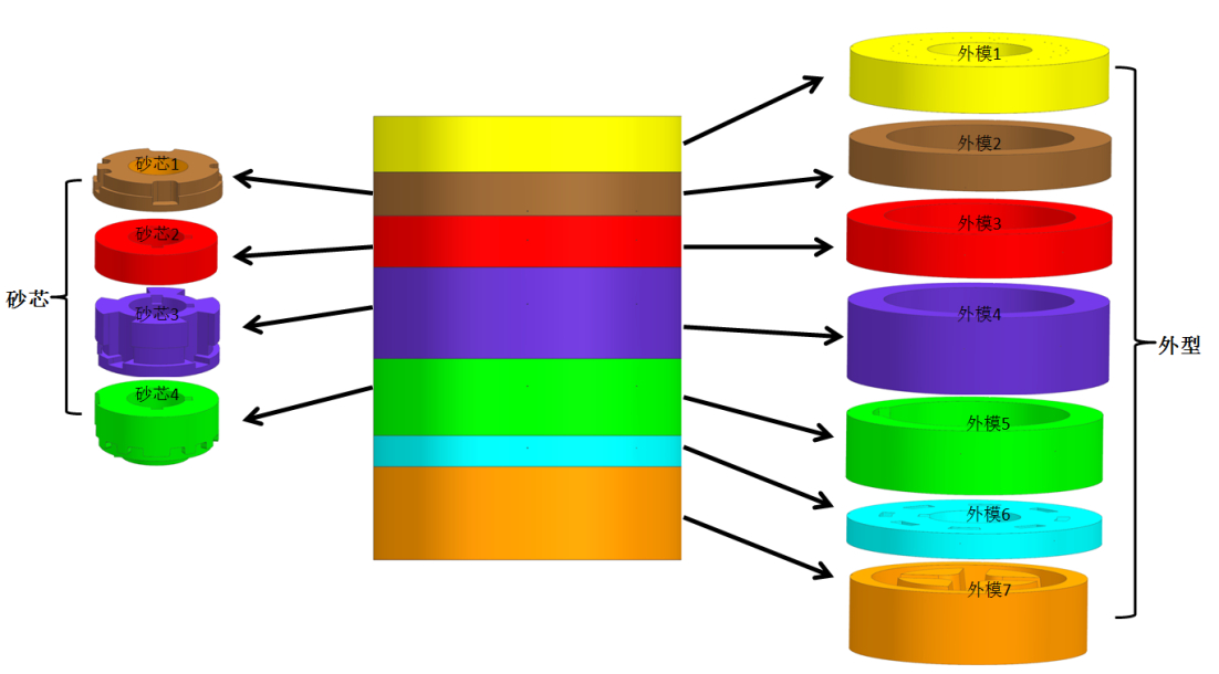 圖3:冷鐵結構及分布示意圖 2.3 復合鑄型設計 為最大限度地實現澆注系統對鑄件的補縮,發揮低壓鑄造的優勢,結合型砂的激冷能力設計由上而下的凝固順序,設計鑄型結構見圖4,采用無模切砂的方式制備各部分砂塊,外部砂型共分為7層,最上面第1層是硅砂層,第2層是鐵砂,第3層鉻鐵礦砂層,第4層是寶珠砂層,第5層、第6層、第7層是陶粒砂層。砂芯由上而下分為4層,第1層為鐵砂,第2層為鉻鐵礦砂,第3層為寶珠砂,第4層為陶粒砂。