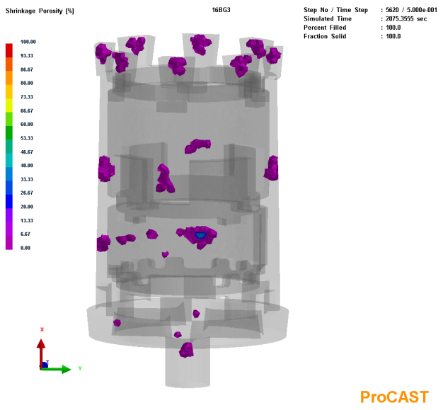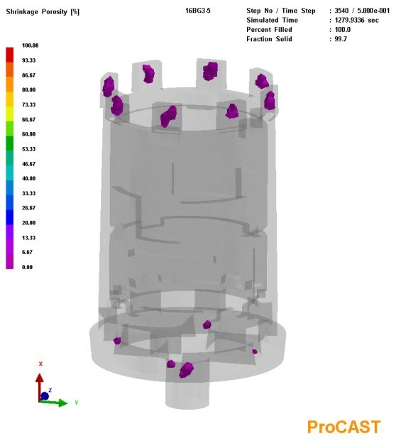 圖11:改進設計后鑄件凝固過程溫度場 鑄件模擬結果的缺陷預測見圖12。可以看到,除了澆注系統和冒口中的縮孔、縮松缺陷外,在鑄件的中下部薄壁區域和中部凸臺之間的薄壁區域的縮松缺陷得到消除,這與鑄件凝固過程溫度場的結果也是一致的。