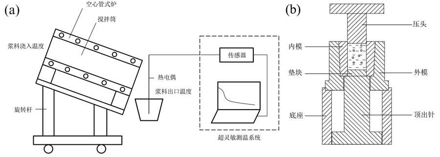 表1:Al-5Zn-2Mg-1Cu-0.2Sc合金的化學成分(wt.%) 2、試驗結果與分析 2.1 入口溫度與出口溫度的關系 圖2為合金漿料澆注溫度(漿料入口溫度)和漿料出口溫度的關系。可以看出,當澆注溫度從760 ℃降至750 ℃時,漿料出口溫度降幅較大。隨著澆注溫度繼續降低至720 ℃,漿料出口溫度基本上呈線性下降的趨勢,但仍高于液相線。當澆注溫度降至710 ℃時,漿料出口溫度開始低于液相線。當澆注溫度進一步降低至690℃時,漿料會在滾筒中直接凝固,見圖3。基于此,本研究中澆注溫度范圍為700~760 ℃。