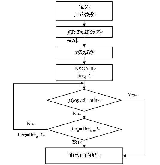 針對式(11),建立了樣本集和驗證集,樣本集用于Kriging建模,驗證集用于Kriging模型驗證。回歸模型選擇0階多項式,相關函數選擇高斯函數。其響應值通過模擬獲得。 NSGA-Ⅱ算法在求解多目標函數問題具有優勢,因此利用NSGA-Ⅱ算法進行求解。圖5為算法求解的流程圖。