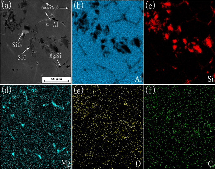 表1:SiCp/ZL101復(fù)合材料的成分 % 將SiCp/ZL101鋁復(fù)合材料進(jìn)行535 ℃×6 h保溫后淬入70 ℃水中,再進(jìn)行150 ℃×6 h的時(shí)效處理。 將得到的試樣進(jìn)行打磨,拋光,使用體積分?jǐn)?shù)為0.5%的HF水溶液對(duì)試樣進(jìn)行腐蝕;用Leica 6000M光學(xué)顯微鏡對(duì)試樣組織進(jìn)行顯微組織觀察;用LYR3 TESCAN掃描電鏡對(duì)試樣進(jìn)行顯微組織掃描和能譜分析,對(duì)拉伸試樣進(jìn)行斷口掃描;使用萬(wàn)能拉伸試驗(yàn)機(jī)進(jìn)行力學(xué)性能測(cè)試;使用華銀顯微硬度儀對(duì)進(jìn)行硬度測(cè)試。 2、試驗(yàn)結(jié)果及分析 2.1微觀組織分析 圖1是SiCp/ZL101鋁復(fù)合材料的SEM及能譜圖。可以看出,復(fù)合材料的界面處主要存在著Al、Si、Mg元素。Al主要分布在晶粒內(nèi)部,分布于基體內(nèi)的SiC顆粒被氧(O)包圍,從圖1c、圖1e和圖1f看出,Si,O和C聚集位置相同,這說(shuō)明經(jīng)預(yù)氧化的SiC表面的SiO2起到了阻礙有害相Al4C3生成的作用。比較Si和Mg的分布(見(jiàn)圖1c和圖1d),發(fā)現(xiàn)Mg和Si在晶內(nèi)晶界處的含量有較大差異,推測(cè)可能是以Mg2Si相的形式存在于晶界處。