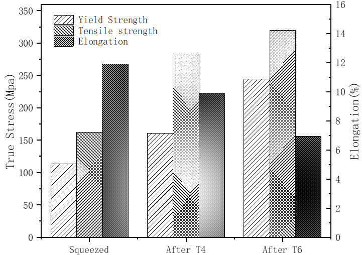 (a)坯料;(b)擠壓;(c)固溶;(d)固溶+時(shí)效圖3SiCp/ZL101復(fù)合材料SEM顯微組織: 2.2 力學(xué)性能 圖4為不同條件下擠壓鑄造SiCp/ZL101復(fù)合材料的力學(xué)性能。可以看出,熱處理前的復(fù)合材料屈服強(qiáng)度、抗拉強(qiáng)度、伸長(zhǎng)率分別為113MPa、162MPa、11.90%,經(jīng)過(guò)固溶處理后,分別為161MPa、282MPa、9.85%,屈服強(qiáng)度和抗拉強(qiáng)度分別增長(zhǎng)了42.48%,74.07%,伸長(zhǎng)率下降了17.23%;固溶+時(shí)效處理后,復(fù)合材料力學(xué)性能進(jìn)一步增加,屈服強(qiáng)度和抗拉強(qiáng)度分別為244MPa,320MPa,增長(zhǎng)了51.55%,13.48%,伸長(zhǎng)率則明顯下降,為6.91%,降低了29.85%。 比較擠壓狀態(tài)和固溶態(tài)復(fù)合材料性能發(fā)現(xiàn),經(jīng)過(guò)固溶處理后,其屈服強(qiáng)度和抗拉強(qiáng)度增幅均較大,這是因?yàn)椋瑥?fù)合材料經(jīng)固溶處理后,殘余應(yīng)力下降,而且因?yàn)镾iCp與基體之間的熱膨脹系數(shù)不同,導(dǎo)致淬火過(guò)程中SiCp與基體之間產(chǎn)生了大量的位錯(cuò),這些位錯(cuò)環(huán)繞在SiCp周圍,使基體晶格畸變程度增高,提高了合金強(qiáng)度,并且在合金受力過(guò)程中,這些位錯(cuò)因?yàn)镾iCp的釘扎作用而難以移動(dòng),提高了合金的變形抗力。固溶過(guò)程使共晶Si形態(tài)發(fā)生轉(zhuǎn)變,因?yàn)楣簿^(qū)是裂紋誘導(dǎo)區(qū),對(duì)裂紋的產(chǎn)生和擴(kuò)展有很大的影響;共晶Si由針狀和條狀轉(zhuǎn)變?yōu)榍驙睿蟠蠼档土斯簿i組織和α-Al基體之間的接觸面積,從而抑制了裂紋的產(chǎn)生。此外,α-Al中的Mg含量也對(duì)復(fù)合材料力學(xué)性能有較明顯的影響,有研究表明,復(fù)合材料的屈服強(qiáng)度與溶于α-Al相的Mg含量的平方根呈正比,說(shuō)明固溶過(guò)程使晶界處的Mg2Si進(jìn)入基體合金,增加了基體合金中的Mg含量。以上因素使材料的屈服強(qiáng)度和抗拉強(qiáng)度有了較大的提升。 比較固溶狀態(tài)和固溶+時(shí)效狀態(tài)復(fù)合材料性能發(fā)現(xiàn),其屈服強(qiáng)度增加幅度大,為51.55%,抗拉強(qiáng)度增幅較小,為13.48%。這是因?yàn)椋m然兩種熱處理后的共晶組織(α-Al+Si)微觀形貌沒(méi)有發(fā)生明顯變化,但時(shí)效過(guò)程促進(jìn)了固溶體中溶質(zhì)原子Mg和Si的析出,聚集的溶質(zhì)原子團(tuán)簇尺寸非常細(xì)小,與基體呈半共格關(guān)系,使共價(jià)鍵的結(jié)合能力也更強(qiáng),位錯(cuò)開(kāi)動(dòng)的阻力也相應(yīng)增大,因此使復(fù)合材料對(duì)塑性變形的抵抗力大幅提升,表現(xiàn)為屈服強(qiáng)度的增加;時(shí)效過(guò)程中產(chǎn)生的Mg、Si原子團(tuán)簇,細(xì)小Si相彌散分布,對(duì)合金的抗拉強(qiáng)度也產(chǎn)生了一定的影響。