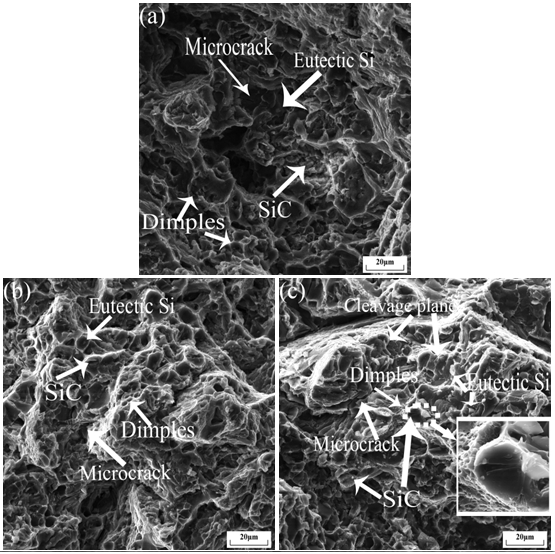 圖4:擠壓鑄造及不同熱處理后SiCp/ZL101鋁復(fù)合材料力學(xué)性能 圖5是不同熱處理?xiàng)l件下的SiCp/ZL101鋁復(fù)合材料拉伸斷口形貌。從圖5a可以看出,經(jīng)過(guò)擠壓鑄造后的復(fù)合材料斷口特征是典型的塑性斷裂,界面上分布著大量的大小不等的韌窩,韌窩尺寸較大,而且比較深,撕裂棱很明顯,韌窩內(nèi)部有平整的共晶Si相界面,這是因?yàn)樵诶煸囼?yàn)過(guò)程中,因?yàn)榫Ы缣幦毕葺^多,且條共晶Si相力學(xué)性能較基體更差,微裂紋產(chǎn)生于條狀共晶Si相內(nèi)部,并在擴(kuò)展的過(guò)程中穿過(guò)第二相形成韌窩,因此復(fù)合材料強(qiáng)度較低。固溶處理后(見(jiàn)圖5b)斷口形貌仍以韌窩為主,韌窩變得均勻,而且尺寸明顯變小,撕裂棱數(shù)量減少,因此復(fù)合材料強(qiáng)度有明顯的提升而塑性變化不大。