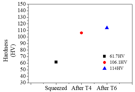 圖6:SiCp/ZL101鋁復(fù)合材料在不同熱處理?xiàng)l件下的顯微硬度 3、結(jié)論 (1)使用半固態(tài)機(jī)械攪拌和近液相線技術(shù)成功制備的SiCp/ZL101鋁復(fù)合材料,顯微組織為近球形的α-Al和共晶Si組織,SiC能較為均勻地分散在基體中;二次加熱后擠壓獲得SiCp/ZL101復(fù)合材料。 (2)經(jīng)過(guò)固溶處理的SiCp/ZL101復(fù)合材料顯微組織中共晶Si的形態(tài)發(fā)生了明顯的轉(zhuǎn)變,由長(zhǎng)條狀轉(zhuǎn)變?yōu)榍驙睿M(jìn)行時(shí)效處理后,基體和增強(qiáng)相界面的析出相數(shù)量增加。 (3)固溶+時(shí)效處理后的SiCp/ZL101復(fù)合材料抗拉強(qiáng)度、屈服強(qiáng)度和伸長(zhǎng)率達(dá)到了320MPa、244MPa和6.91%,硬度(HV)達(dá)到114;斷裂機(jī)理由微孔聚集型斷裂轉(zhuǎn)變?yōu)闇?zhǔn)解理斷裂,時(shí)效過(guò)程析出的第二相和產(chǎn)生的原子聚集區(qū)可能是導(dǎo)致材料塑性大幅下降的原因。