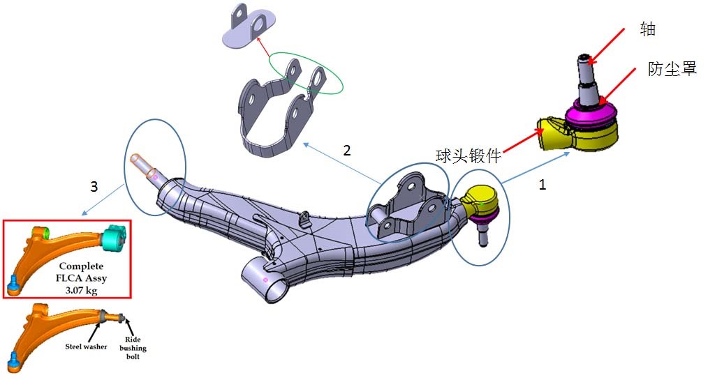 圖2:鋁合金控制臂的概念設計方案 圖 2中1處,將控制臂改為鋁合金鑄件后,球頭組件與控制臂的連接方式將由原有的焊接方式改為螺栓連接。為滿足更改后的連接方式,球頭鍛件的結構必須重新進行設計,并通過機械加工完成樣件制作。只允許更改連接部分與球頭相關的部件包括軸,防塵、球碗、卡環、球頭銷,夾子和球套結構則不允許更改。 為保證鑄件的結構完整性,鑄造工藝性能以及鑄件的整體性能,確認將原有沖焊的減震器支座分為兩體設計。減震器主支座改為鋁合金設計,并與控制臂主體完成集成設計。減震器副支座仍然為沖焊結構,在通過對原有部件切割的基礎上增加底座,通過焊接的方式形成組件,組件通過螺栓連接的方式與鋁合金控制臂連接,組件的結構示意見圖 2中2處。在鋁合金控制臂上要設計副支座的安裝限位,保證安裝到位。 圖 2中3處在原有設計中所有部件均為鋼制部件,更改為鋁合金后,軸部位材料為鋁合金,與之配合的是鋼制部件,在通常情況下鋁合金部件不能夠與其發生直接的摩擦配合。考慮有兩種解決方案,其一通常是采用增加鋼制墊片的方式解決鋁制部件與鋼制部件的配合問題,在增加鋼制墊片后,原有設計中軸的尺寸將發生改變,需要重新設計;其二是借用原有的鋼制部件,重新設計連接部分結構,通過螺栓連接實現部件的裝配。 2.2 產品的設計方案 圖 3鋁合金控制臂的設計方案。基于原有沖焊部件設計,無法對原有周邊的裝配環境進行更改,必須仔細考慮原有部件的結構與裝配。總體設計方案是采用集成設計“H”型的鋁合金擠壓控制臂取代原有的上板,下板,連接上板,連接下板,襯套套管和減震器支架形成一個整體控制臂。