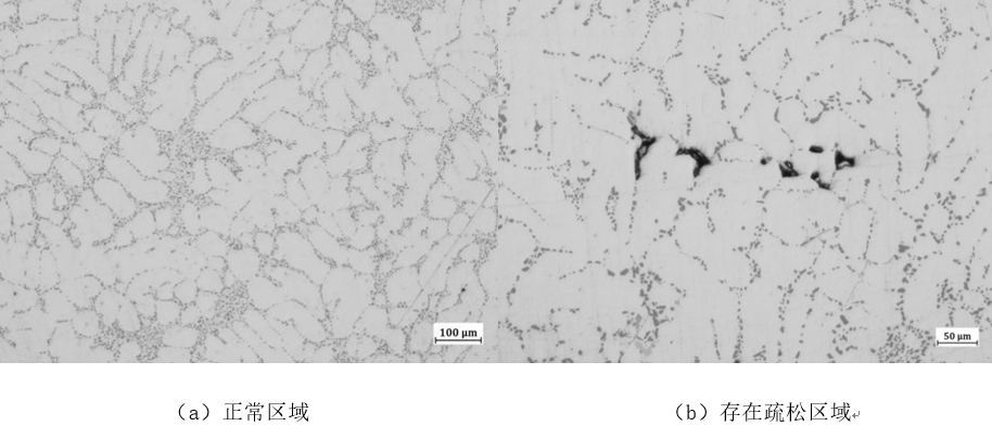 圖9:疏松缺陷的微觀斷口形貌(a. 試樣3;b. 試樣4) 3、結論 (1)鋁合金長臂件用A356合金經過精煉、變質和細化處理,鑄件的金相組織正常,晶粒細化,氣孔和氧化夾雜很少,對力學性能不穩(wěn)定的影響不大。 (2)當鑄型溫度控制不當,經由壁厚較小部位向壁厚較大部位輸送的鋁合金液在厚壁較小部位首先凝固后,厚度較大部位的鋁合金液在無補縮壓力下凝固和結晶時出現的疏松缺陷,是鋁合金長臂件最外端的壁厚較大部位力學性能不穩(wěn)定的主要原因。