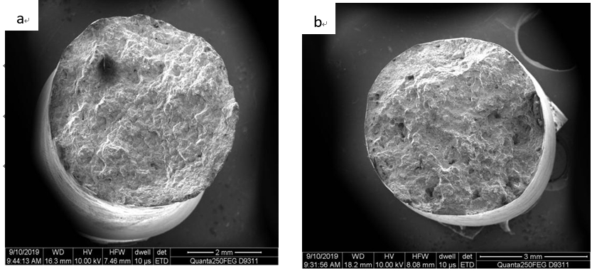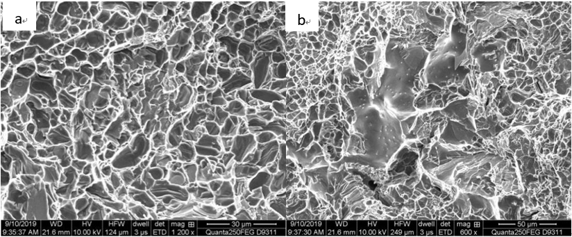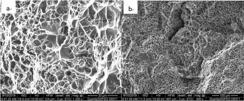 圖3:試樣3的斷口形貌(a. 大而深的韌窩;b. 二次拉伸裂紋)