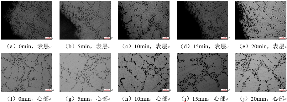 圖5:不同試樣表層至心部顯微硬度變化情況 圖6和圖7分別為不同噴丸時間試樣的表層及心部的金相組織。可以看出,經過噴丸處理后表層組織的共晶Si明顯減小,并隨著噴丸時間的增加,細化效果更加明顯,表層組織變得更加均勻,共晶Si晶粒變得更加細小均勻。噴丸處理能有效的細化組織,使共晶Si相分布均勻。由于噴丸時高速粒子對表層的撞擊作用會碎化粗大的共晶Si相,細化組織。 對單一試樣由于噴丸處理使組織表層發生塑性變形,共晶Si分布更加均勻,且隨著噴丸時間的延長金相表層組織的均勻性增加;對于噴丸時間不同的試樣,隨著噴丸時間的延長,表層的晶粒變得愈加細小,具有比心部更小且均勻的組織。