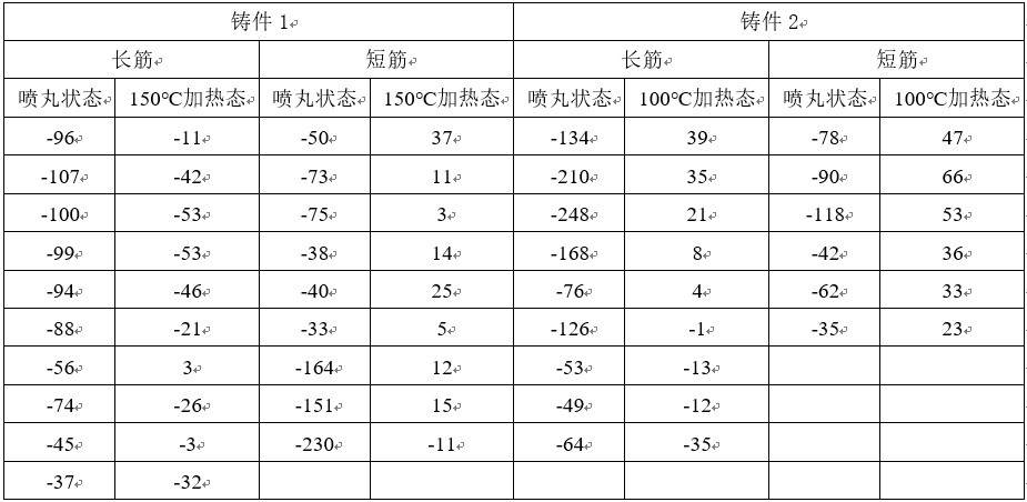 表1:鑄件加強筋表面殘余應力 2.2 環境模擬加熱溫度對A356鑄造鋁合金噴丸層殘余應力的影響 兩種鑄件的應力測定情況匯總于見表2。由此可見,由于在進行加熱之前對試樣表面進行了噴丸處理,長、短筋表層普遍存在壓應力狀態,而經過加熱之后噴丸處理所帶來的壓應力狀態明顯消退,這是由于溫度升高使試樣表層應力狀態恢復為原始的拉應力狀態或拉壓應力交替存在狀態,拉應力的存在會降低表層試樣的強度和塑性,故這將不利于試樣的疲勞性能。為此噴丸后鑄件推薦在室溫或長時間受熱溫度不高(建議低于100 ℃)的環境下使用較為合適,這樣有利于保持鑄件局部的噴丸強化效果。