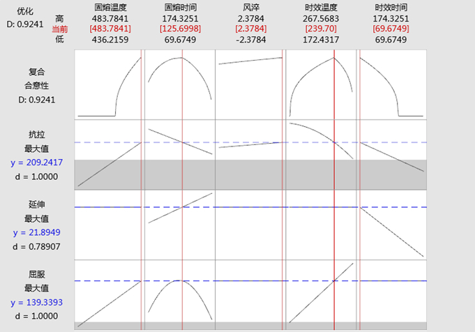 表5:增加軸點的實驗設計方案和力學性能結果 加了軸點數據后,繼續用minitab對數據進行響應曲面分析,把P大于0.05的進行刪減精簡得出各項力學性能的回歸模型如下: 抗拉強度=-197+0.801*固溶溫度-0.0367*固溶時間+5.29*風淬+0.527*時效溫度+2.021*時效時間- 0.001645*時效溫度*時效溫度-0.00448*固溶溫度*時效時間-0.0375 固溶時間*風淬 屈服強度=-236.8+0.453*固溶溫度+1.459*固溶時間+0.2926*時效溫度-0.00610*固熔時間*固溶時間 伸長率=21.62+0.02780*固溶時間-0.04616*時效時間 響應優化參數見表6,可以看出對抗拉強度、屈服強度、伸長率進行望大處理,下限設為試棒力學性能要求的最小值,目標為各自的上限,最后得出最終精化模型的多響應優化見圖6。