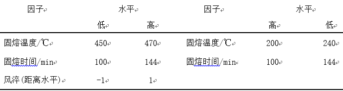 表1:鑄態下試樣本體和試棒的力學性能要求 2、試驗設計和分析優化 2.1 試驗設計 在材料成分一定的前提下,壓鑄件內部含氣量與力學性能呈反比關系, T7比T5,T6熱處理力學性能更優。所以通過Minitab軟件使用兩水平(固溶溫度、固溶時間、風淬、時效溫度、時效時間)設計,對T7熱處理工藝范圍內設計變量見表2。