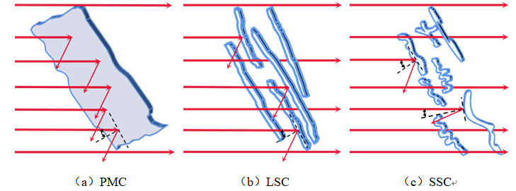 式中,ρT為合金的基礎電阻,僅與溫度有關,ρR為雜質電阻,其構成為: 式中 和分別為析出相、固溶度、位錯和晶界對合金原子和引起的電阻。 對電子運動的影響程度主要取決于位移、晶界、合金元素固溶和晶間析出相等缺陷的數量和結構。位錯密度和晶界面積越大,散射電子的越多,合金的熱導率越低;合金中的元素固溶度越高,引起基體的晶格畸變就越嚴重,破壞鋁基體中原子的有序程度和原有周期性電場的分布,產生缺陷和應力場;晶間析出相的數量越多,尺寸越大,對電子的散射作用越強,電子平均自由程減小,導致合金導熱性能的下降。 室溫下,低密度空位和位錯對電阻率的影響甚小,且在僅改變鑄造方式而未進行塑性變形及退火的情況下,不同試樣之間的位錯密度并無明顯差異,故可忽略其對熱導率的影響。冷卻速率的變化會一定程度上改變Al基體晶粒尺寸和晶界的總面積,LI B等也指出晶粒尺寸的變化對熱導率的影響微乎其微,熱導率并未隨晶粒的顯著細化而明顯下降。 對Al-Si合金而言中,Si和Al形成置換固溶體,但Si在Al中固溶度很小,最大飽和固溶度僅為1.65%,而室溫下僅為0.05%,其余的Si會以單質形式與Al一起形成Al-Si共晶組織。A356鋁合金中Si質量分數約為7.06%,僅有極少量固溶在Al基體內,而更多的是以Al-Si共晶形式析出。Si原子半徑(0.134 nm)與Al(0.143 nm)十分接近,Si原子固溶引起的Al基體晶格畸變很小,因此基體中固溶的Si對Al的熱導率影響不大,而主要是晶界處析出的共晶Si帶來的影響。李斌等也認為當Si質量分數為7.0%~12.8%時,Al基體的晶格畸變程度很小,且隨Si含量的變化不明顯。 晶間析出相對基體的割裂是導致A356鋁合金熱導率較純Al下降的主要原因。依照3種鑄造方式試樣共晶Si相的SEM照片繪制其對電子遷移的阻礙作用示意圖見圖9。PMC試樣中共晶Si相尺寸粗大的板條狀,集聚分布,電子難以通過或繞過共晶Si晶粒完成能量的輸運。在機械擠壓力的作用下,合金致密度提高,原子間距縮短,基體連接性增強,自由電子自由程增大,對合金熱導率起到了提升作用。LSC在細化α-Al基體晶粒時難免增大了晶界面積,但同時也完成了對共晶Si晶粒顯著的細化作用,使其變為長桿狀,面積大幅縮小,拓寬了電子輸運的通路,整體上表現為能量輸運效率的提高即熱導率的上升;SSC試樣晶間共晶Si相得到了一定的破碎和球化,邊緣變得圓鈍,整體變為蠕蟲狀。鈍化的共晶相邊緣能降低散射作用發生的概率,其機制主要包括減小散射面積、改散射碰撞為切過和增加電子在基體中的自由程并改變散射方向幾種途徑,見圖10。可見共晶Si相的球化將很大程度上減弱其對自由電子遷移的阻礙作用,改善A356鋁合金的導熱性能。