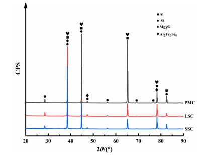 圖4:不同成形方式制備A356鋁合金的共晶Si相形貌 A356鋁合金屬于亞共晶Al-Si合金在凝固時,首先析出初生α-Al相,Si相在共晶時析出,分布在α-Al基體晶粒的晶界處,因此共晶Si相的形貌一定程度上受到基體晶粒的影響,共晶反應的結束也標志著凝固過程的結束。統計并計算共晶Si相等積圓直徑,長徑比和形狀因子見圖5。PMC試樣中共晶Si相尺寸分布較為分散,僅存在極少量直徑為2~3 μm的小尺寸晶粒,平均直徑為4.40 μm,最大達8.32 μm;長徑比為7.92,形狀因子為0.34。LSC試樣由于擠壓力對晶粒的細化作用,共晶Si相尺寸分布較PMC也有所集中,尺寸顯著減小,平均等積圓直徑下降到2.05 μm,最大直徑降為4.11 μm;長徑比為6.48,形狀因子為0.398。SSC澆注溫度較低而充型后冷卻速度較快,使共晶Si尺寸進一步減小,形貌發生變化,多數晶粒半徑小于2 μm,平均直徑降至1.61 μm,最大半徑僅為3.5 μm;長徑比下降至3.64,形狀因子上升到0.472。 圖6為不同鑄造方式鑄件的X射線衍射圖譜。可以看出,成形方式并不會改變合金的相組成,3種方式鑄造的試樣組織中主要相組成均為α-Al和Si相,同時存在強化相(Mg2Si)和富Fe相(Al2Fe3Si4)。由于擠壓力的存在加快了凝固速率,可能使少量基體中的Fe和Mg原子固溶在基體內形成固溶體,來不及擴散析出并相互結合形成第二相(Mg2Si)和富Fe相(Al2Fe3Si4)。