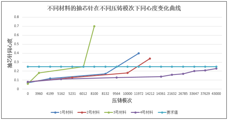 圖5 長抽芯高壓點冷冷卻結構 3、抽芯針材料 不同材料的抽芯針強度不一樣。選用不同材料的抽芯針,在其他條件保持不變的情況下,進行壓鑄驗證,記錄并跟蹤抽芯針壓鑄一定模次之后抽芯針的同心度變化情況(見圖6)。1號材料為熱作模具鋼,硬度為HRC 40~50,材料屈服強度為490~685 MPa,抗拉強度為685~985 MPa;2號材料是在1號材料上進行改良,保留了1號材料的優點,并且得到更好的耐熱裂紋性;3號材料為高速鋼,硬度≥56HRC;4號為特殊熱作模具鋼,硬度為52~57HRC,高硬度,高韌性和極高熱穩定性。隨著壓鑄模次增加,從同心度的變化可以看出,1號材料、2號材料、3號材料的抽芯針在壓鑄模次未達到1.5萬就出現抽芯針同心度大于所要求值0.25。4號材料的抽芯針的同心度隨著壓鑄模次增加穩定較好,且壓鑄模次達到4.3萬模次,同心度仍小于所有要求值0.25。說明4號材料的抽芯針在其壓鑄過程中變形較小。為了更好杜絕長抽芯針變形,選用4號材料的抽芯針,同時抽芯針壽命收嚴至3萬模次管控,且每次上模壓鑄前均需要打表測量抽芯針的同心度。