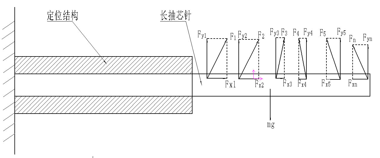 圖7 抽芯針受力數學模型 多點進澆方式,鋁液溫度為660 ℃,模具溫度為150 ℃,噴涂時間為17 s,冷卻時間為11 s對抽芯針變形和偏擺影響不明顯。抽芯針采用T型連接、定位塊定位和采用高壓點冷冷卻,研發出長抽芯針與針套配合段分段式結構,減少抽芯針與針套磨損,減少抽芯針變形和偏擺的可能性。W360材料抽芯針強度可滿足此抽芯針實際所需承受的力,減少抽芯針變形和偏擺的可能性。 4、結語 按照以上壓鑄生產工藝、模具結構、采用W360材料抽芯針,我司變速箱側蓋高壓油道長抽芯針未出現變形和偏擺導致油道孔壁厚問題。